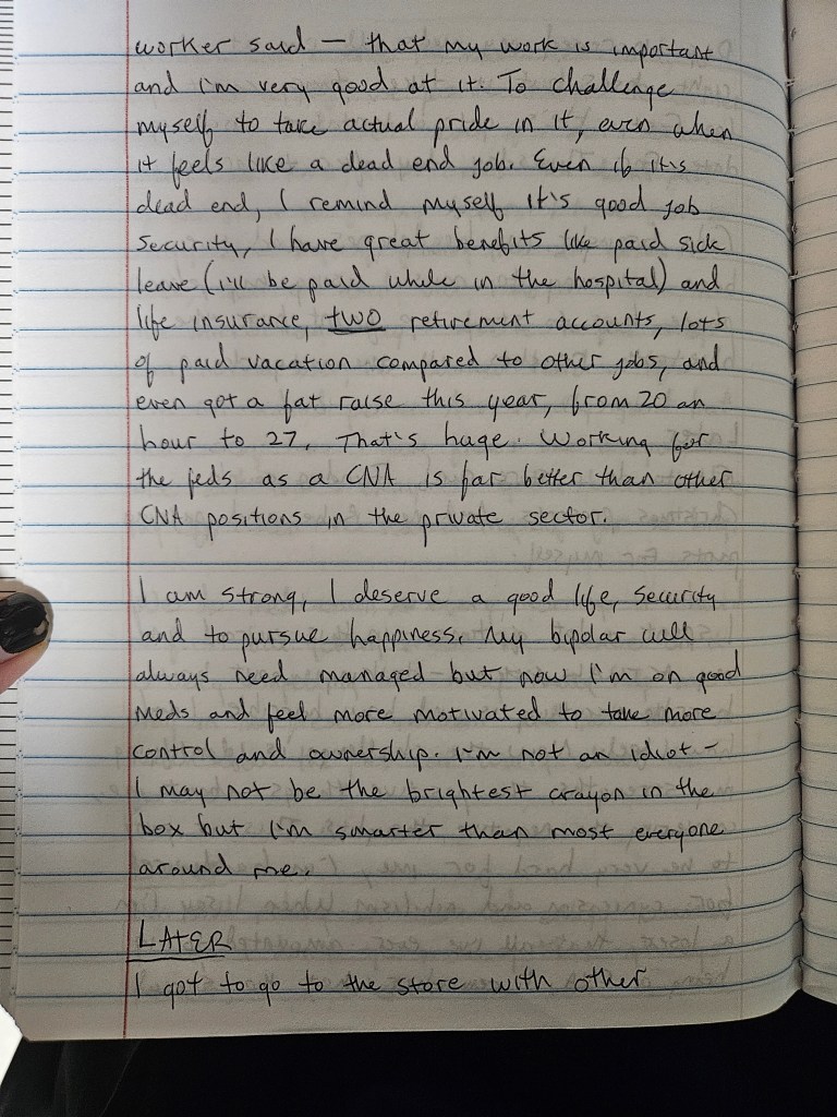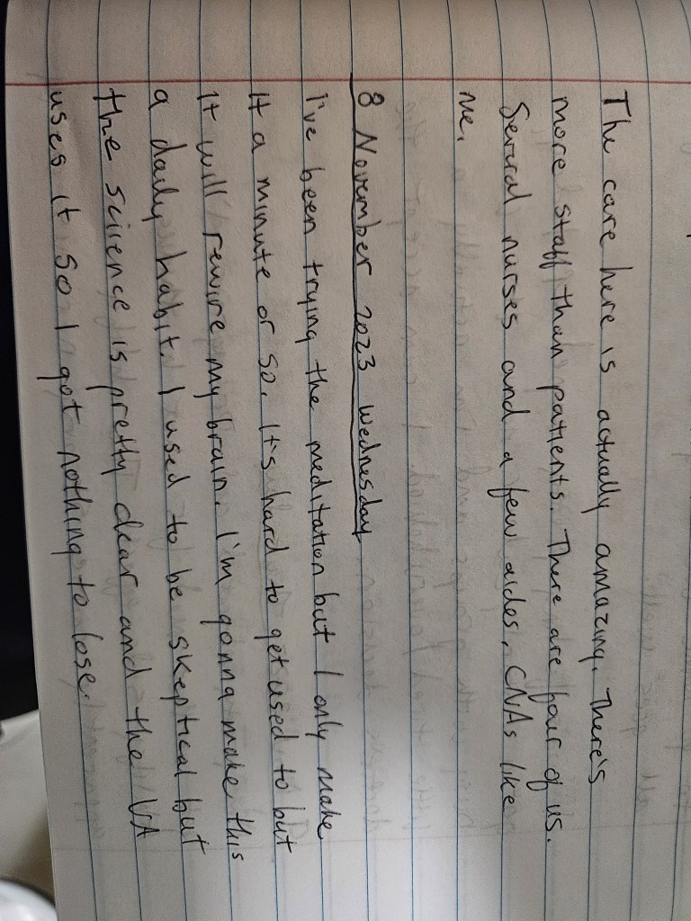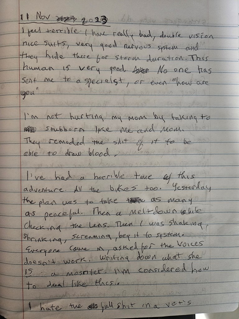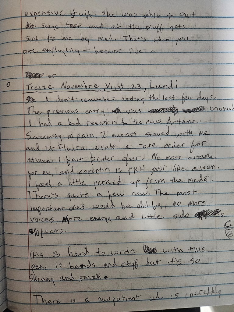 As I started to stabilize just slightly, inching a little closer toward cautious optimism, I had a terrible reaction to a medication that was supposed to help me with extrapyramidal symptoms. What follows is some of my writings while psychotic. I don’t remember writing any of it.